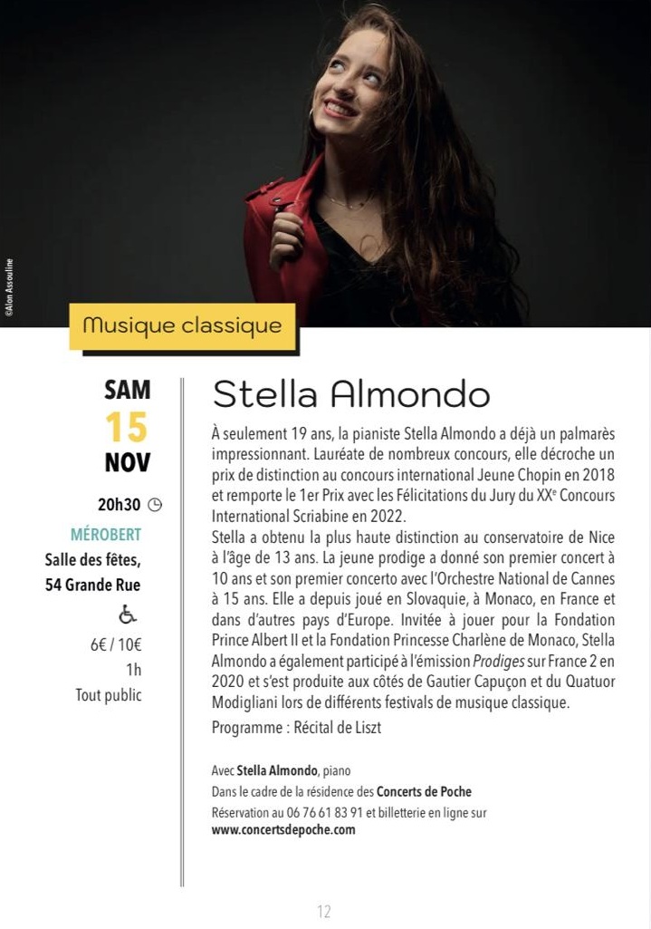 Ce jour-là, la salle des fêtes accueille la talentueuse pianiste Stella Almondo pour un moment musical exceptionnel.